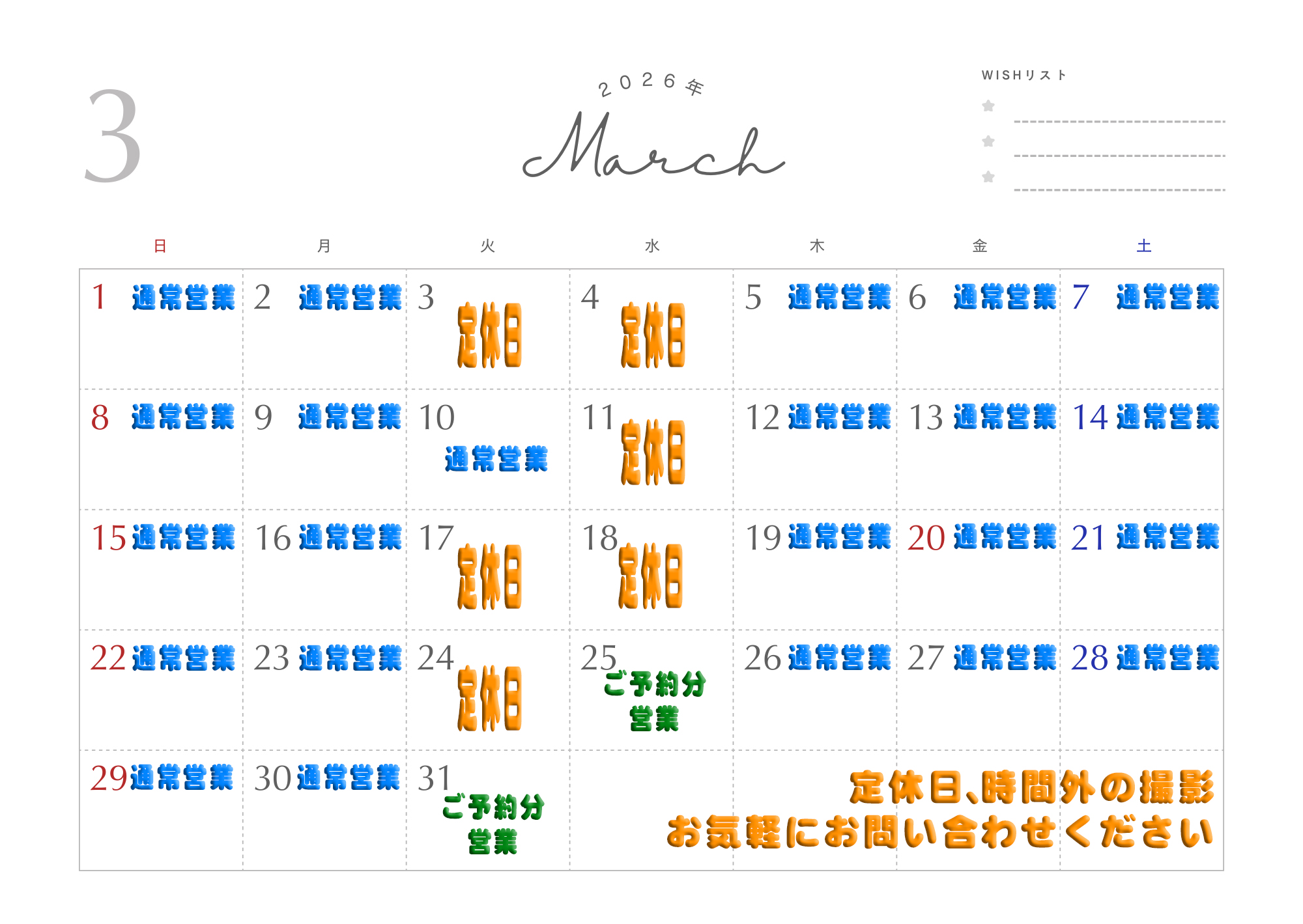 時間外、定休日などに撮影ご希望の方はお問い合わせください